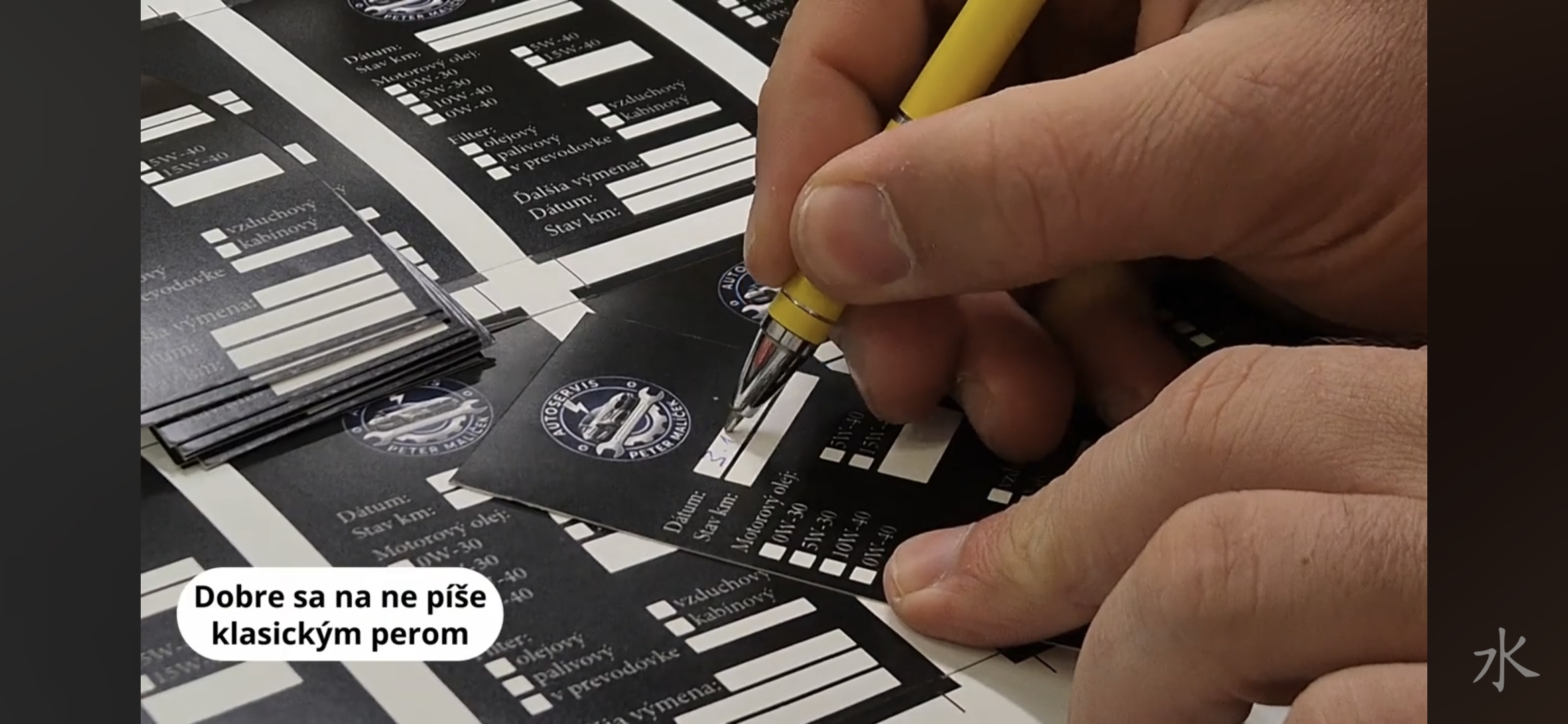 - Vyplň údaje (dátum, km, typ oleja) pred nalepením – píše sa pohodlnejšie.